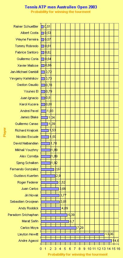 For every match the winner is determined by random with the function of the probabilities for head to head matches. With the tournament rules (schedule) the next matches for the winner and loser was determined. This procedure was done iteratively until the statistics (frequent of winning or each player) will approach equilibrium values.